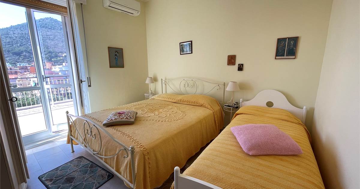 ingresso - cucina dotata di lavastoviglie - bagno - camera con letto matrimoniale più un letto singolo e aria condizionata - sala con divano letto singolo - terrazzo di 50 metri quadri.