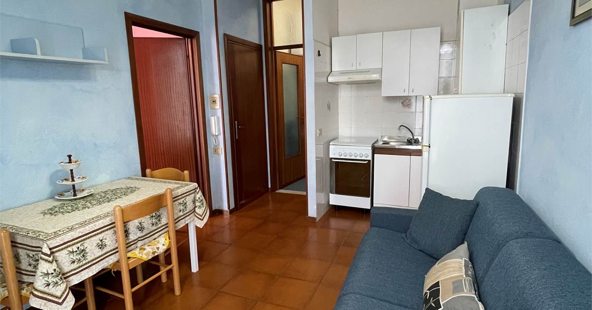 Ingresso in soggiorno con angolo cottura e con divano letto - camera con letto matrimoniale - bagno - balcone - tv - lavatrice - 1° piano senza ascensore .